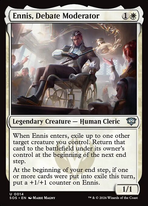 - Texto de la carta: When Ennis enters, exile up to one other target creature you control. Return that card to the battlefield under its owner’s control at the beginning of the next end step. At the beginning of your end step, if one or more cards were put into exile this turn, put a +1/+1 counter on Ennis.