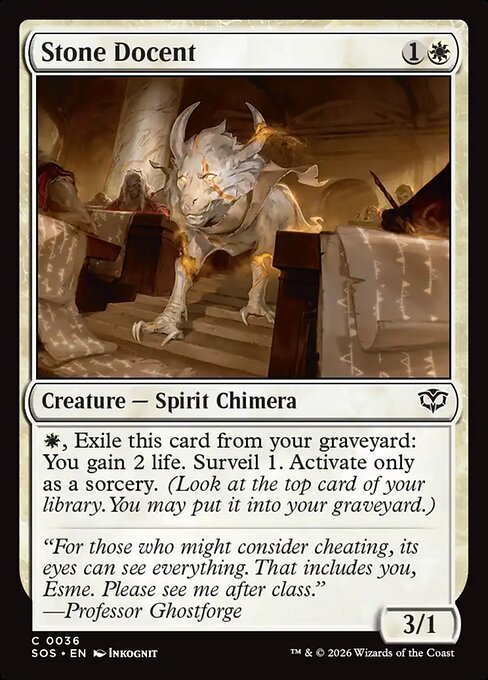 Texto de la carta: {W}, Exile this card from your graveyard: You gain 2 life. Surveil 1. Activate only as a sorcery. (Look at the top card of your library. You may put it into your graveyard.)
